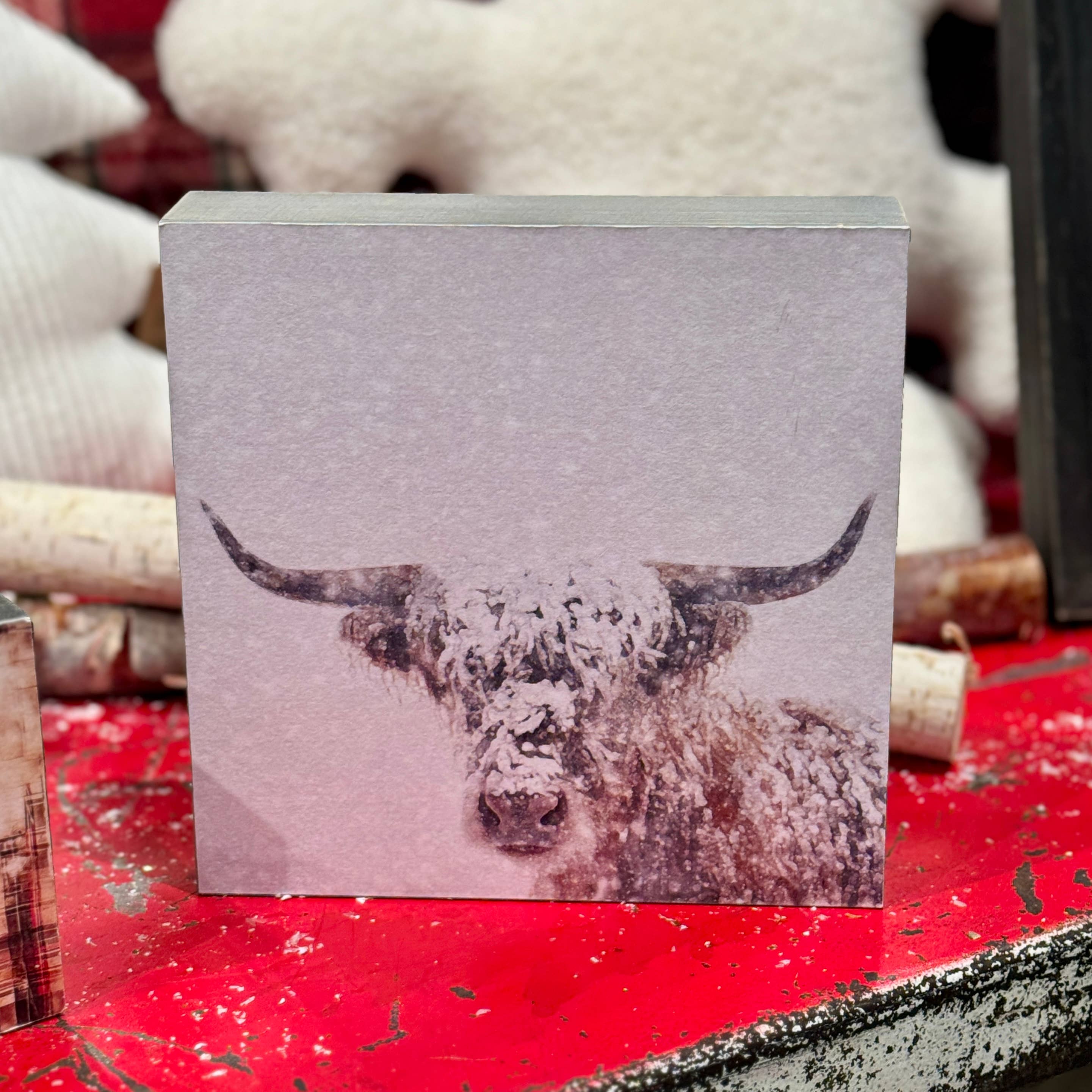 This charming gray washed wood box measures 7" wide by 7" tall and 1½" deep. Featuring winter cow artwork printed on paper and securely affixed to the front, it adds a cozy, seasonal touch to your decor.