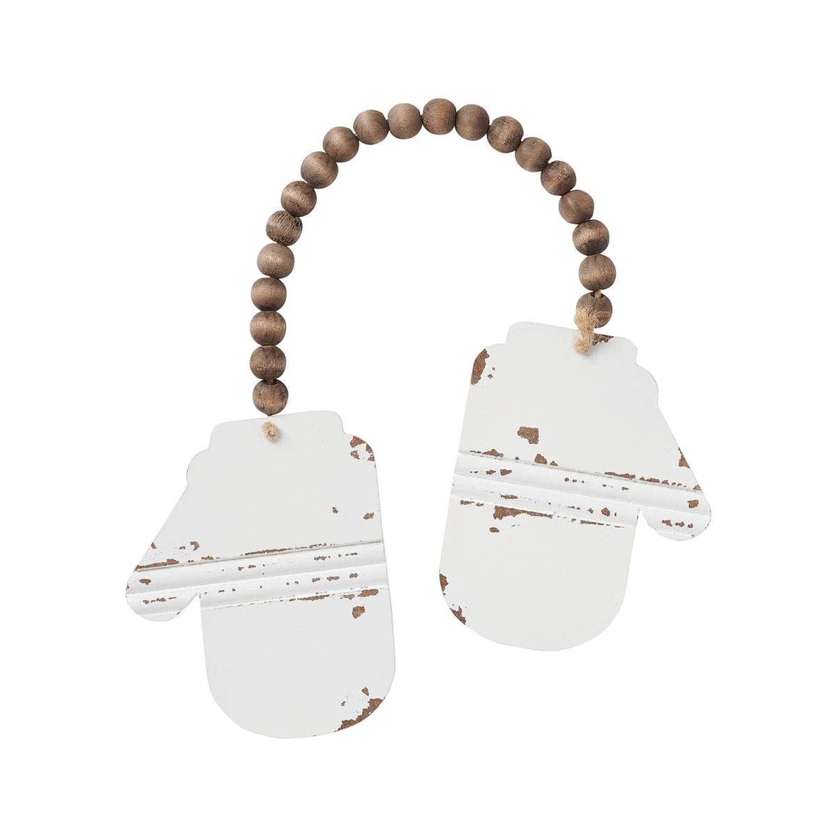 Mittens chippy ornament Measurements: 3 1/4" w x 4" t x 1/4" d. Chippy white wood mitten ornaments with beaded strand to hang.