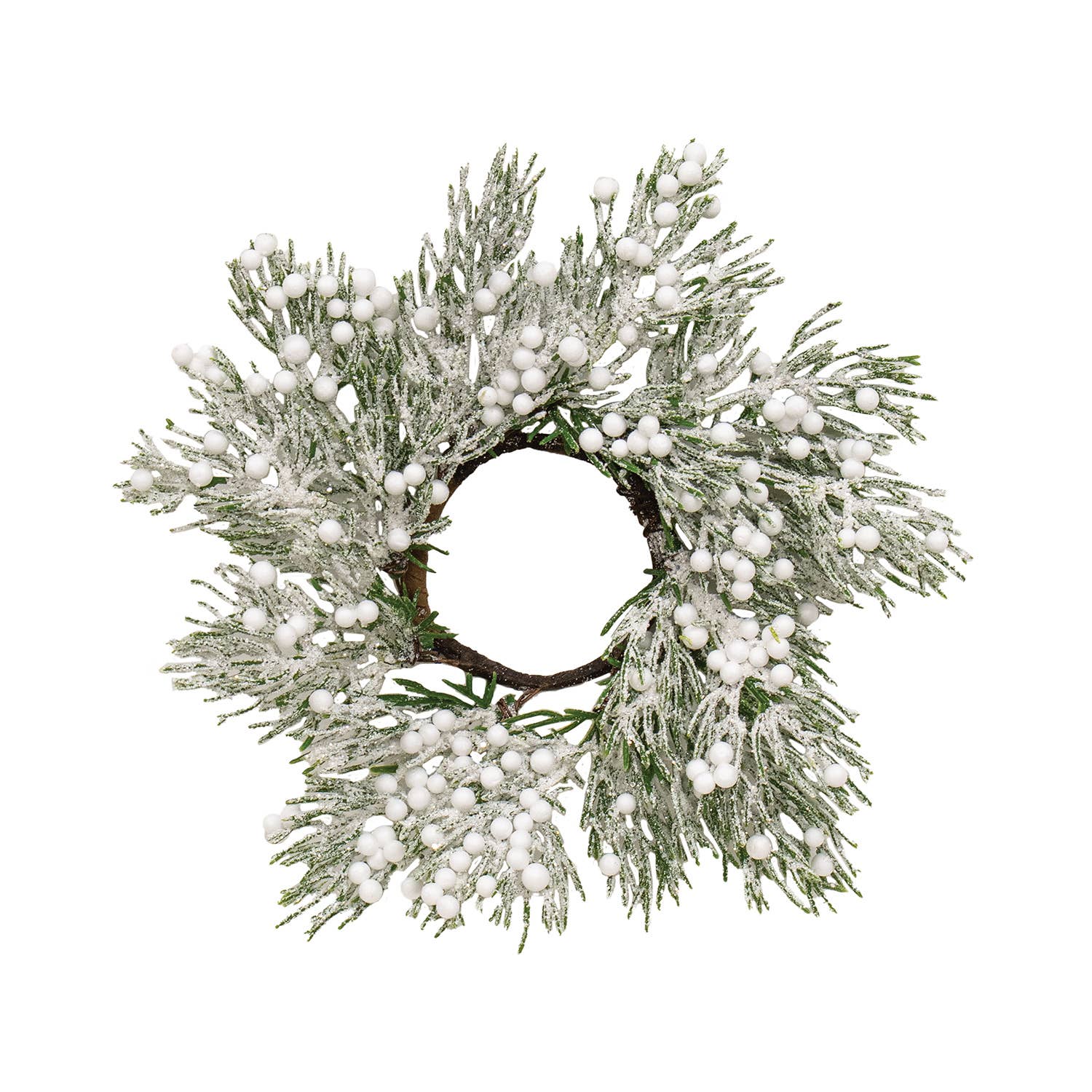 Elevate your holiday tablescape with this exquisite Frosted Snow Berry & Pine Ring. This 2-inch inner diameter candle ring combines pristine white berries and lush pine sprigs on a sturdy brown base, all kissed with a glittery snow finish for that coveted winter sparkle. Whether you're styling it solo around a votive or layering it into a larger seasonal arrangement, this 6-7 inch outer diameter ring delivers instant festive elegance. Watch it transform your Christmas décor into a dazzling display that captures the frosty beauty of the season.