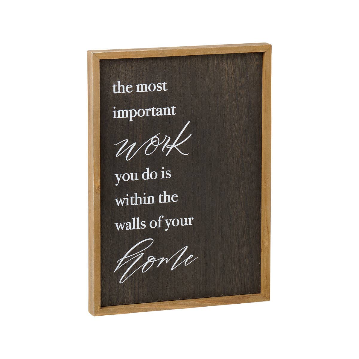 Side 2: "the most important work you do is within the walls of your home" Wood Washed Framed Sign with Black Washed Wood Background and White Text"
