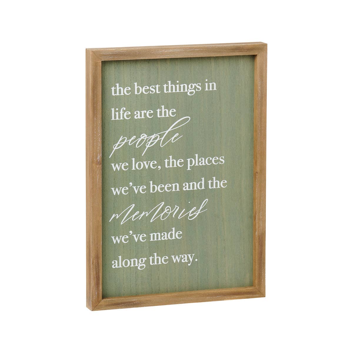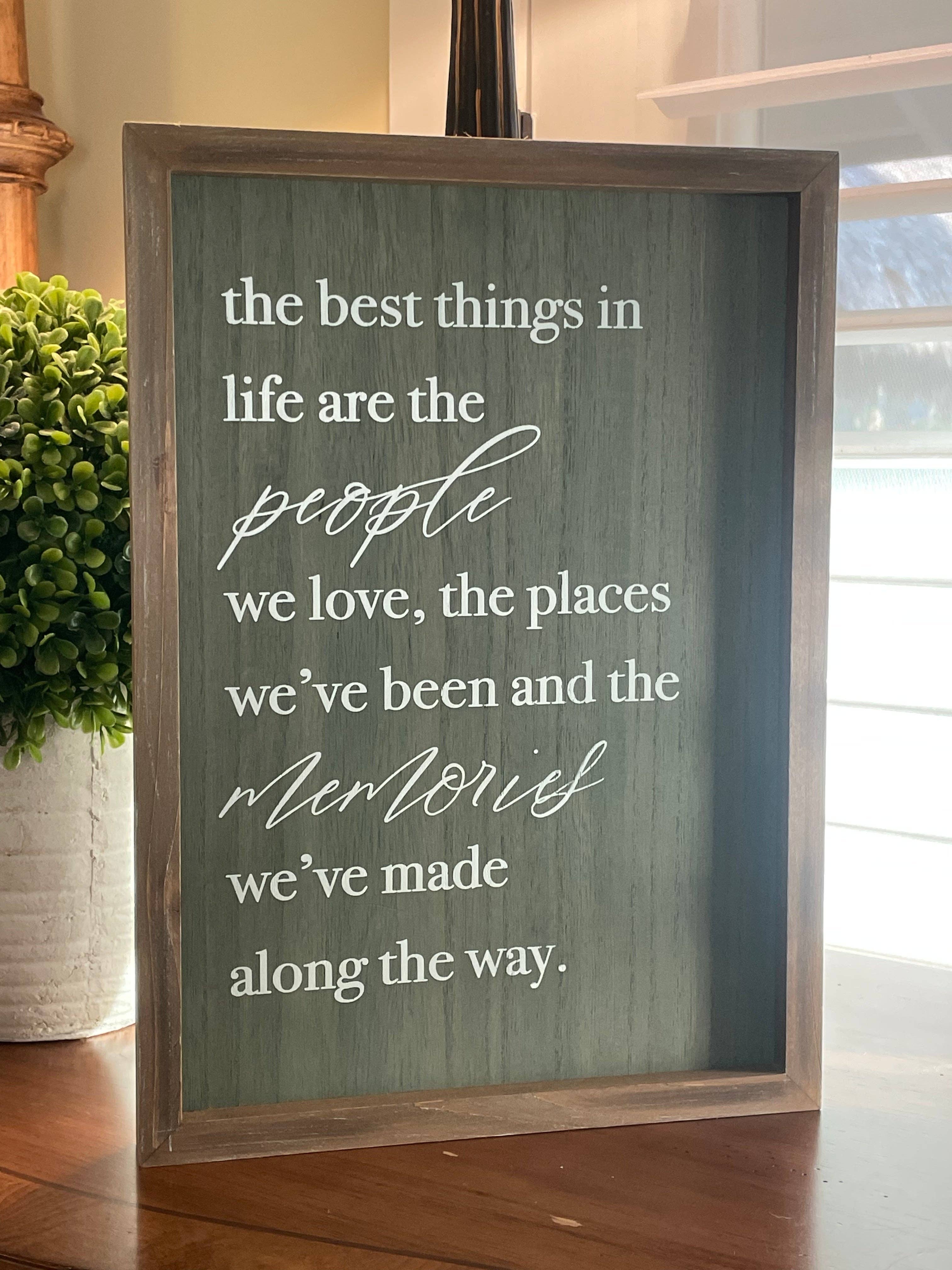Side 1: "the best things in life are the people we love, the places we've been and the memories we've made along the way" Wood Washed Framed Sign with Green Washed Wood Background and White Text