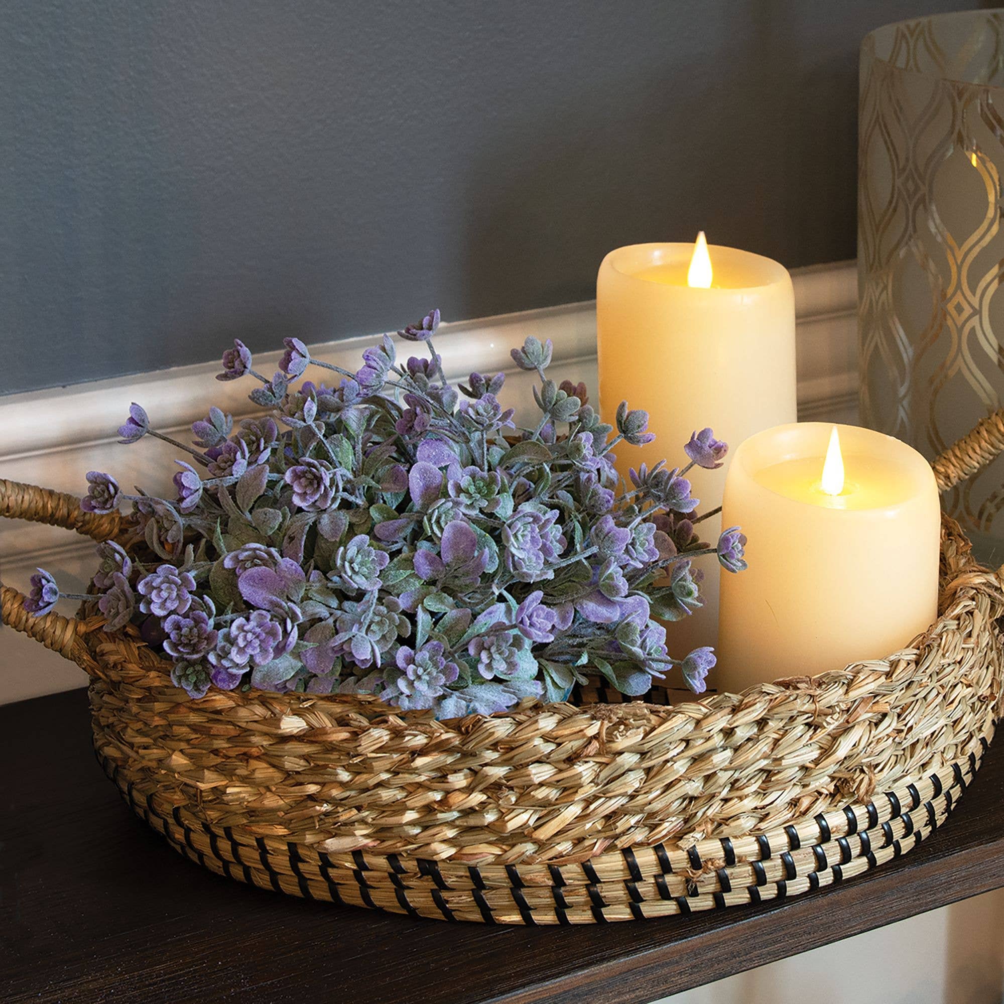 The Dusk Lavender Buds Half Sphere is a decorative floral accent with a half-sphere shape and natural green base. The half-sphere is filled with soft, dusty lamb’s ear greenery and features whimsical lavender floral blooms. Display this sphere sitting on a bowl, tray, pedestal, basket, or other tabletop vessel to bring a sweet and simple touch to the home during Spring. Measures 10” in diameter.