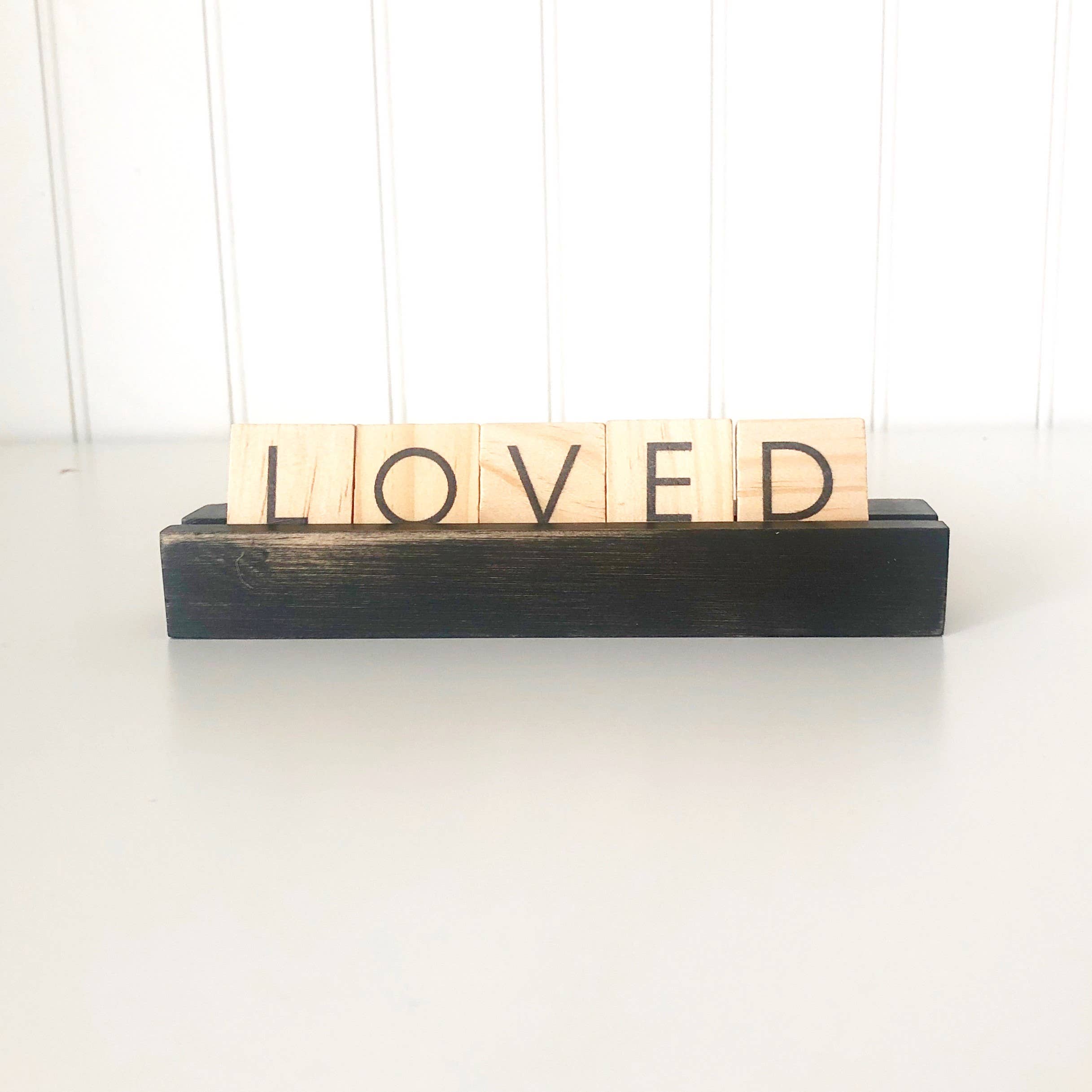 Versatile black scrabble tile holder featuring grooves on both sides for displaying either taller or shorter tiles. Includes double-sided tiles spelling "LOVED" on one side and "HELLO" on the other. Designed to hold up to 6 letter tiles and measures about 7.25 inches wide.