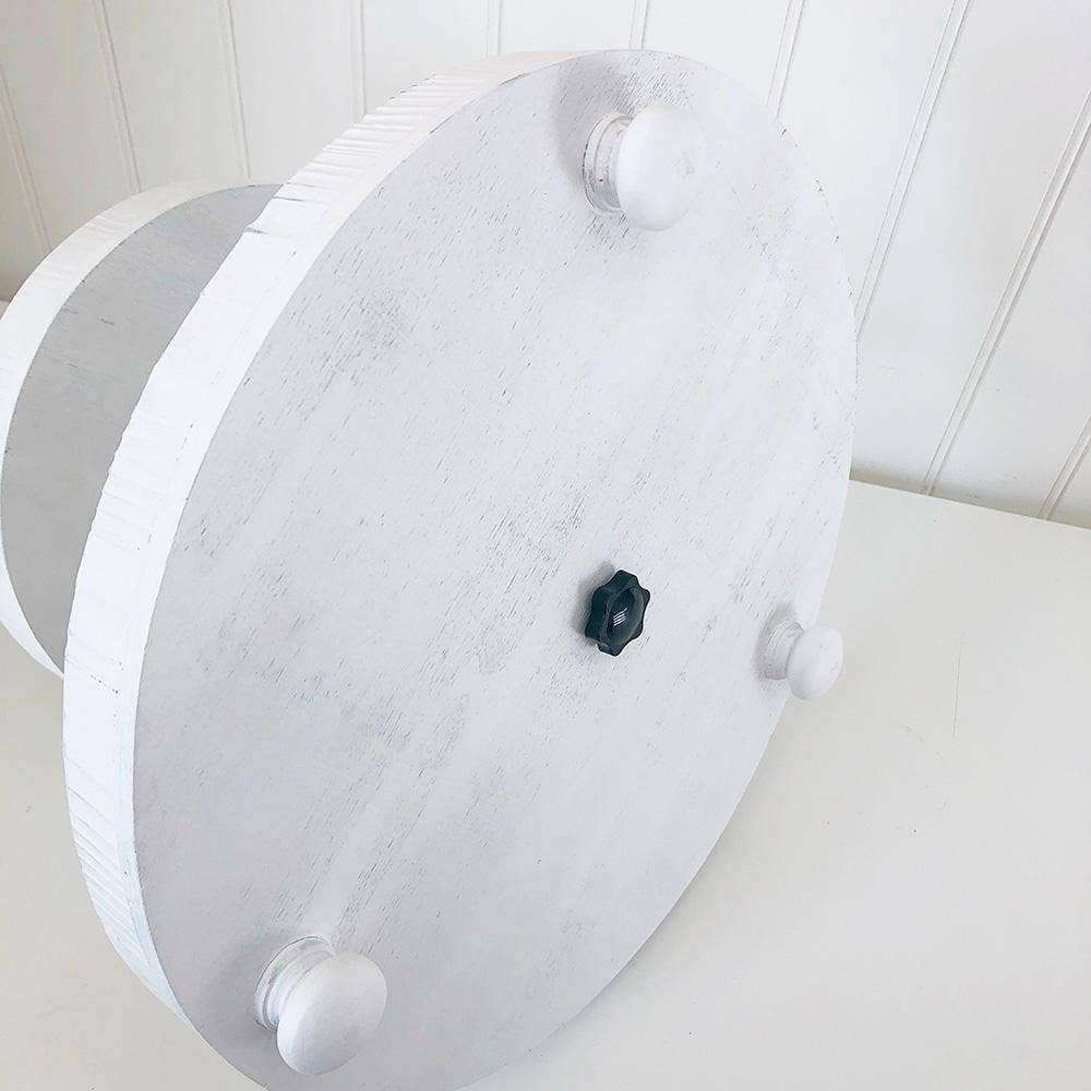 This charming distressed wood tray is sure to impress. With a base nearly 40% larger than typical trays, it offers ample space to showcase more decor while maintaining perfect proportions. The bottom tray measures 15 inches in diameter, and the top tray is 9.875 inches across, with an overall height of 18 inches. Assembly is quick and effortless—no tools needed, ready in under a minute!
