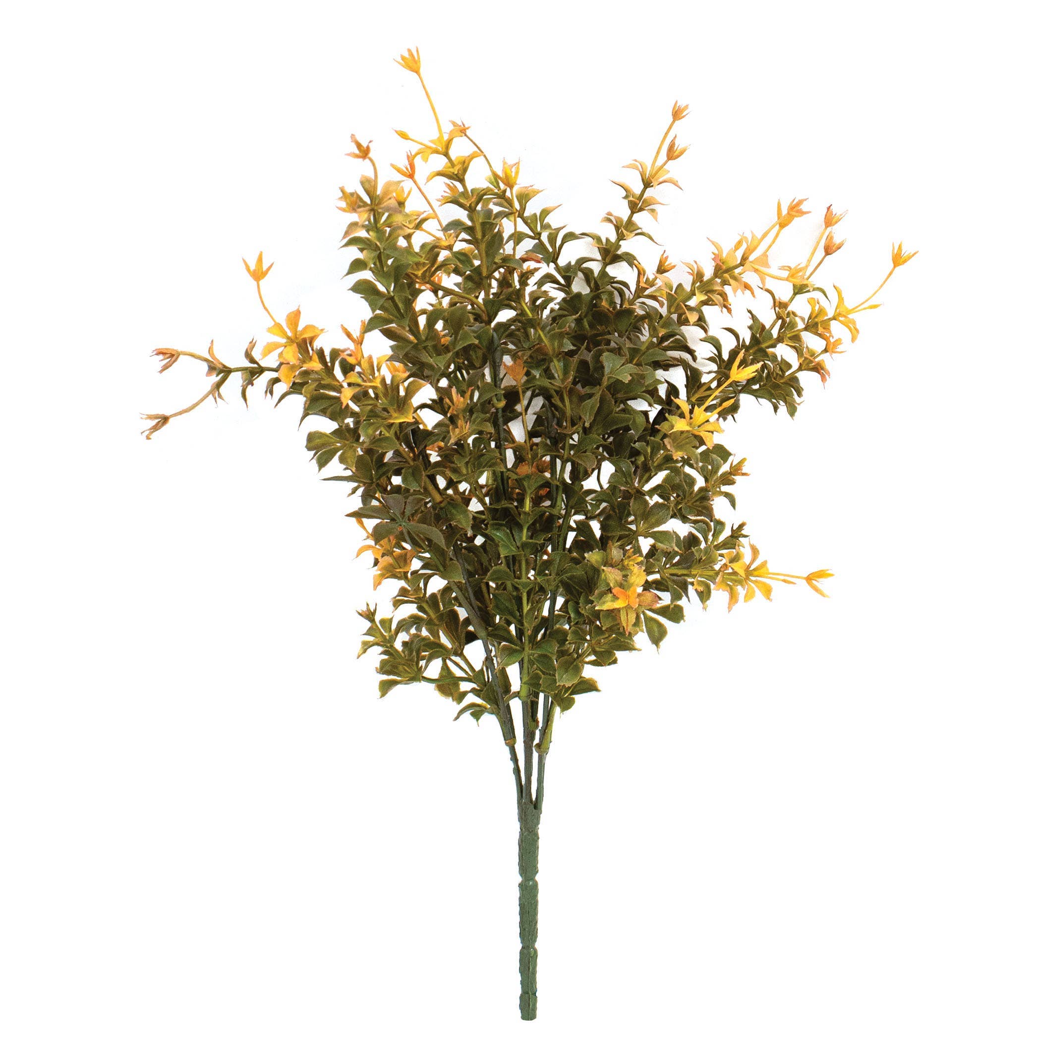 The Golden Trumpet Bush is a versatile fall floral meant to fill a vase or complete an Autumn arrangement. A green stem starts the bush, sprouting a voluminous arrangement of branches with dimensional green coloring. Small leaves adorn each branch, with dark green leaves toward the base and golden yellow leaves appearing toward the top of the bush. Measures 13” high by 3” in diameter.