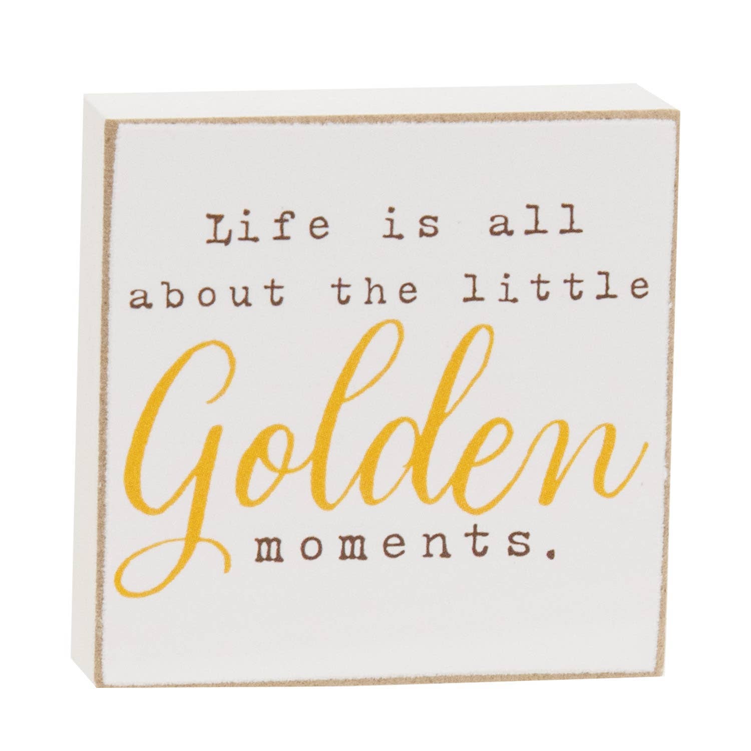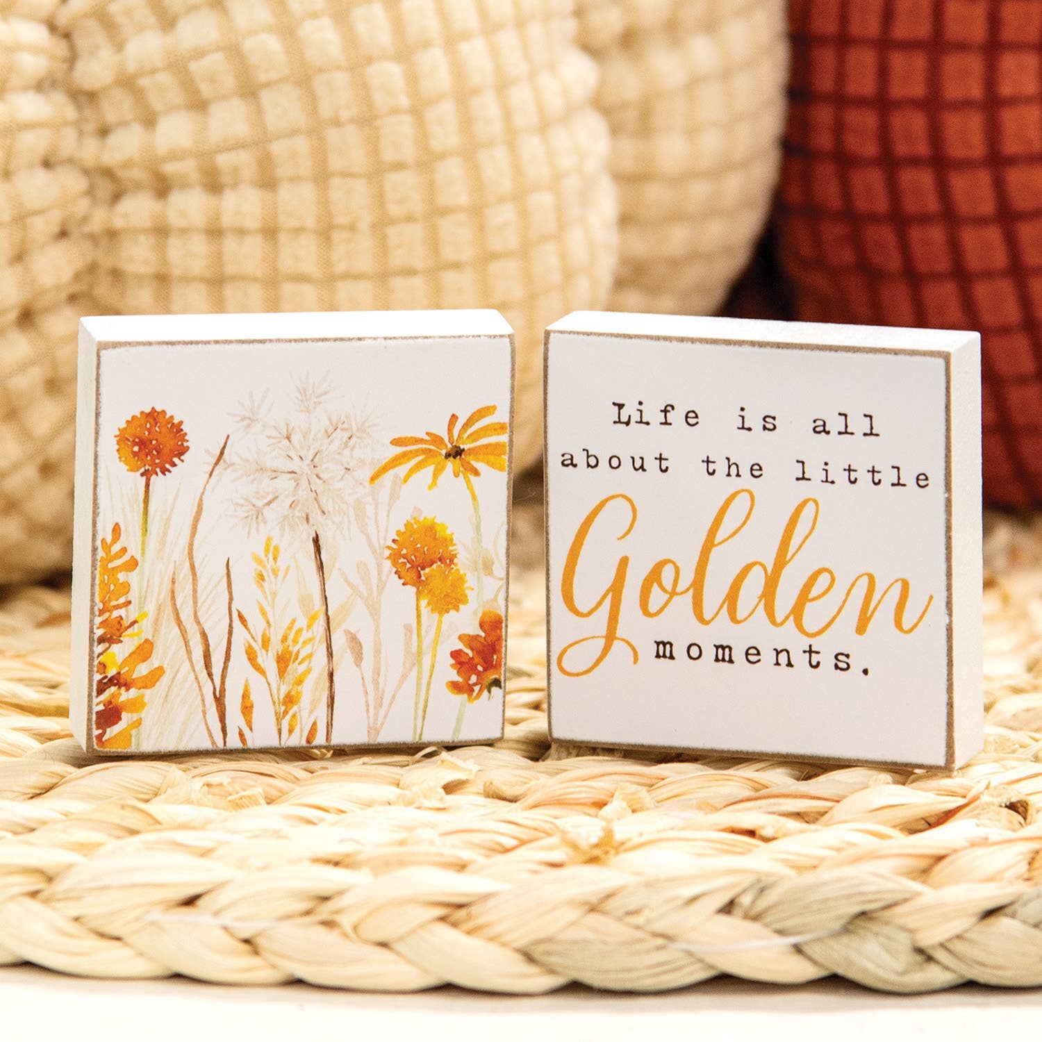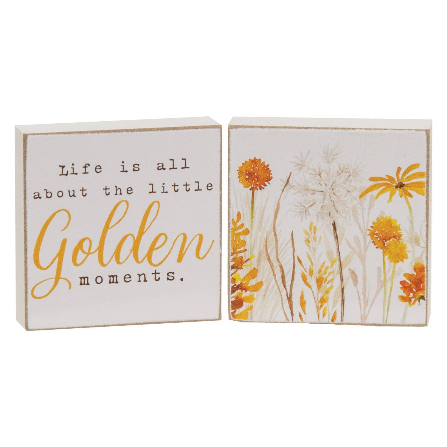 Golden Fall Wildflower Blocks add thoughtful charm to shelf or tabletop decor. Crafted from wood, the square blocks each feature a white painted finish with distressed edges for a rustic look. A watercolor depiction of a field of golden yellow, orange, and cream flowers adorns one of the blocks. The other block reads “life is all about the little golden moments” in a mix of black print and golden yellow script fonts. Each measures 2” high by 2” wide by .5” deep.