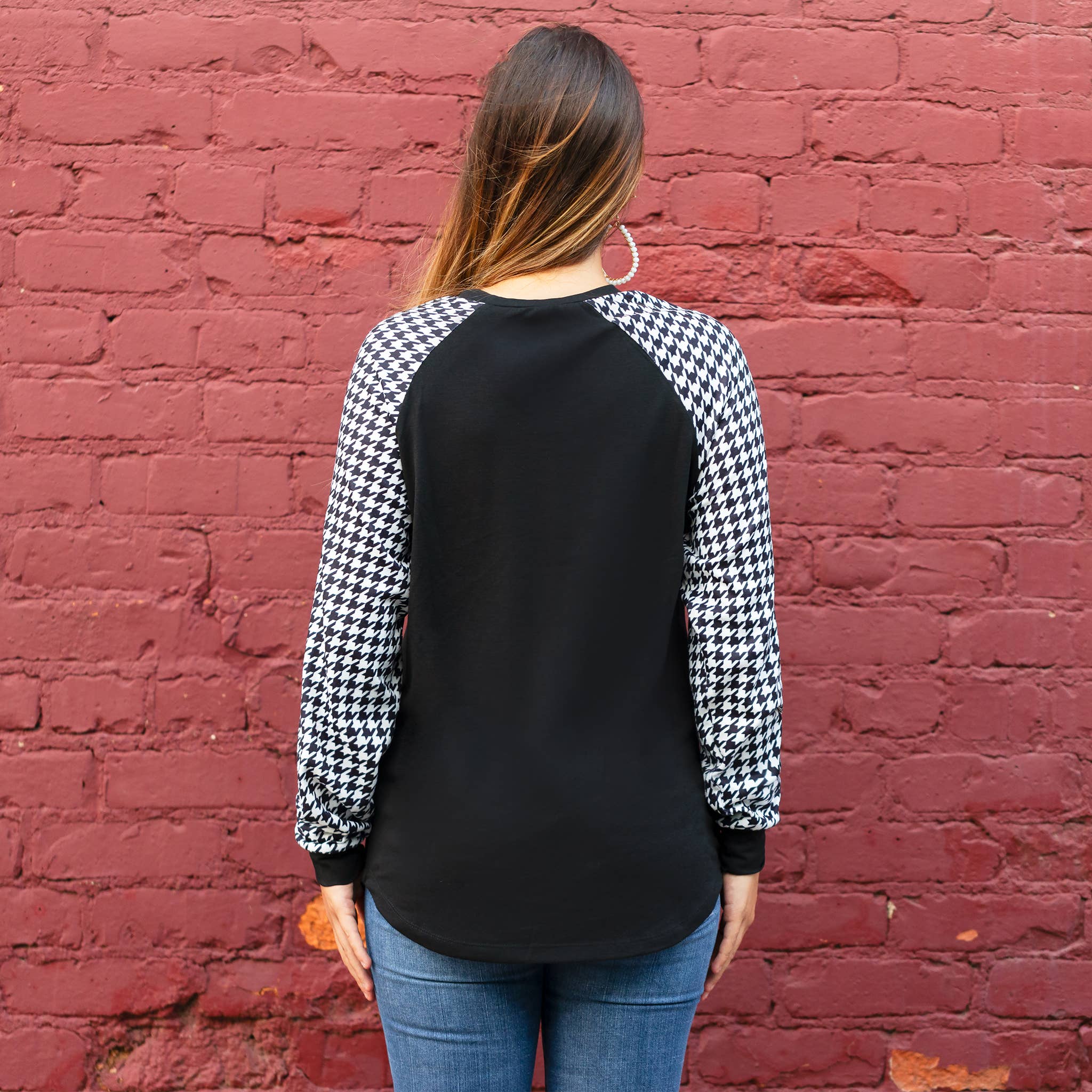 Elevate your wardrobe with this striking Houndstooth Pattern Long Sleeve Top, a versatile piece that seamlessly transitions from casual to polished. Crafted from a premium blend of 95% polyester and 5% spandex, this top offers the perfect balance of comfort and structure, allowing you to move with confidence throughout your day. The timeless houndstooth pattern adds instant sophistication to any outfit, while the long sleeves provide coverage and style. Designed to flatter, as shown on our model wearing a Small. Exclusive design by Sunshine & Rodeos, Copyright 2025.
