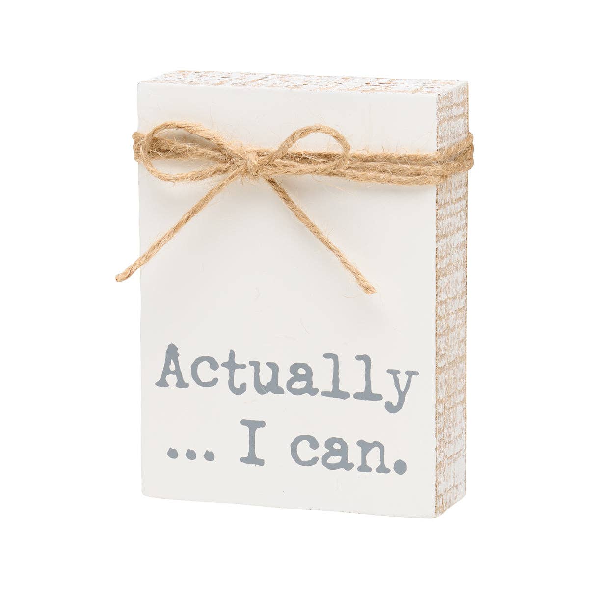 This charming wooden block sign celebrates your "Actually, I can" attitude with style! Featuring crisp white lettering against weathered wood sides, it's the perfect motivational accent for any space. Measuring 3" wide by 4" tall by 1" deep, this compact piece includes a decorative jute bow tied around the top for rustic charm. Display it on a shelf, desk, or nightstand as a daily reminder that you've got this!
