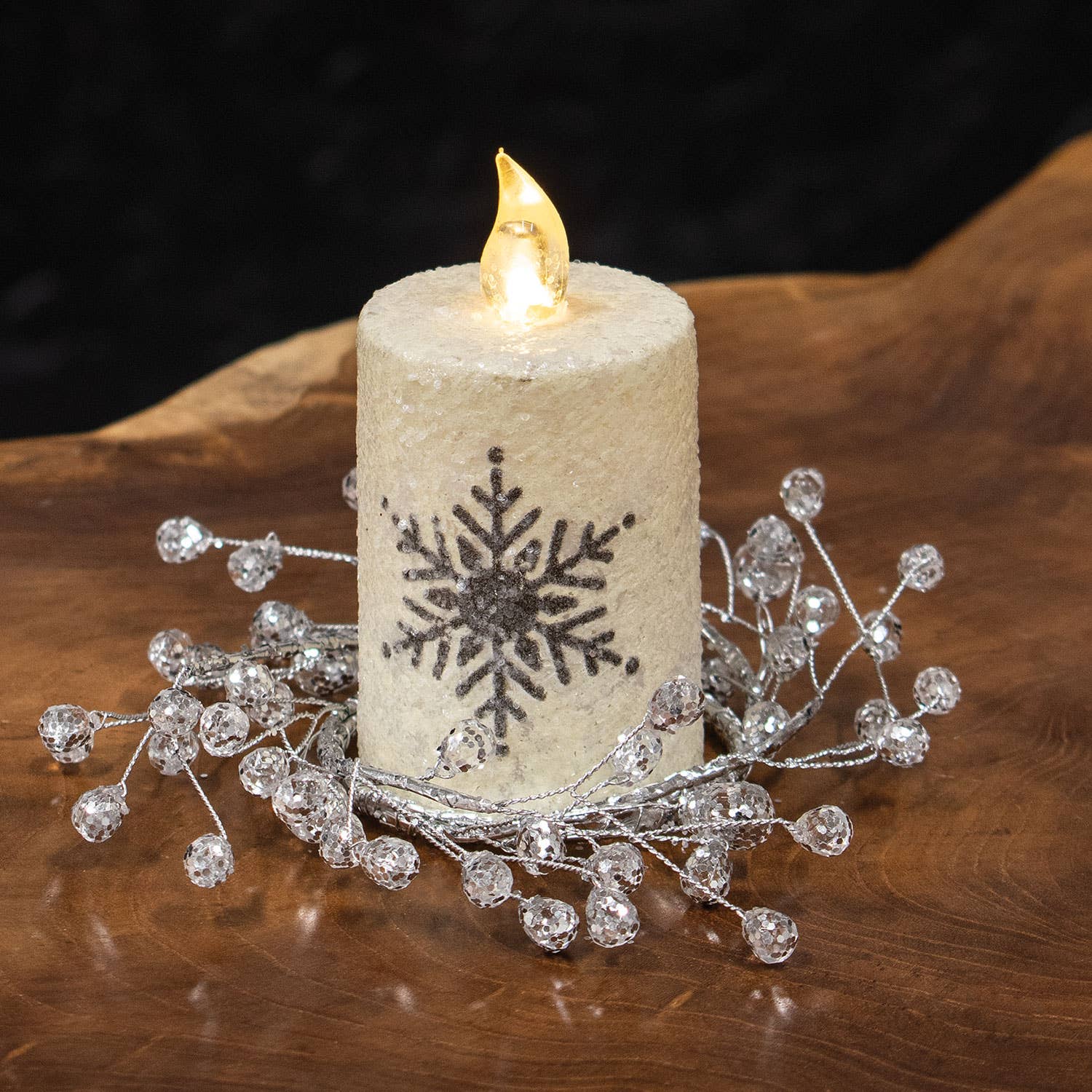 Make the farmhouse a little more merry and bright with the sparkle of the Icy Gems Candle Ring, 2.5". This enchanting candle ring brings an icy feel to displays with its clear plastic crystals coated in silver glitter. The stems are wrapped wire for easy shaping and it measures 2.5" on the inside diameter and 4.5" to 6" on the outside diameter. This ring will add a little wintry bling to smaller pillar candles, tapers, and flameless tealights.