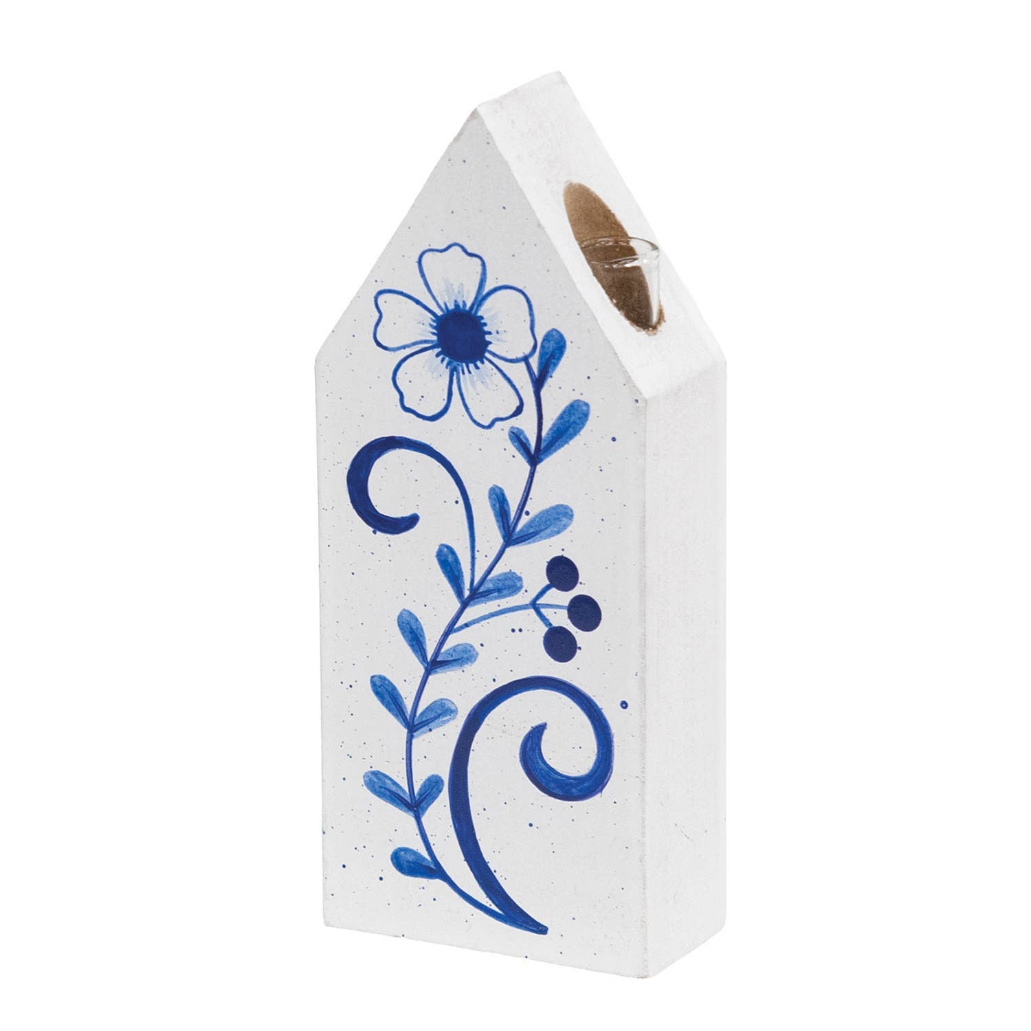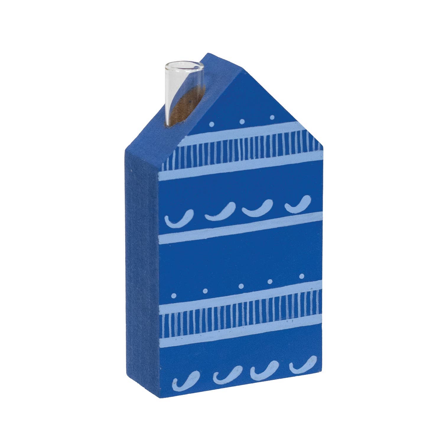 Our Bud Vase House Sitters come are simple house-shaped blocks featuring the clever touch of bud vase tubes in place of chimneys. The mixed florals striped and plaid patterns in shades of blue are ideal for fresh spring and summer decorating. The glass bud vase portion is affixed into the house and is 2.5" deep and 0.5 wide. Houses are 1" thick and range from 4.5" to 3.5" tall.