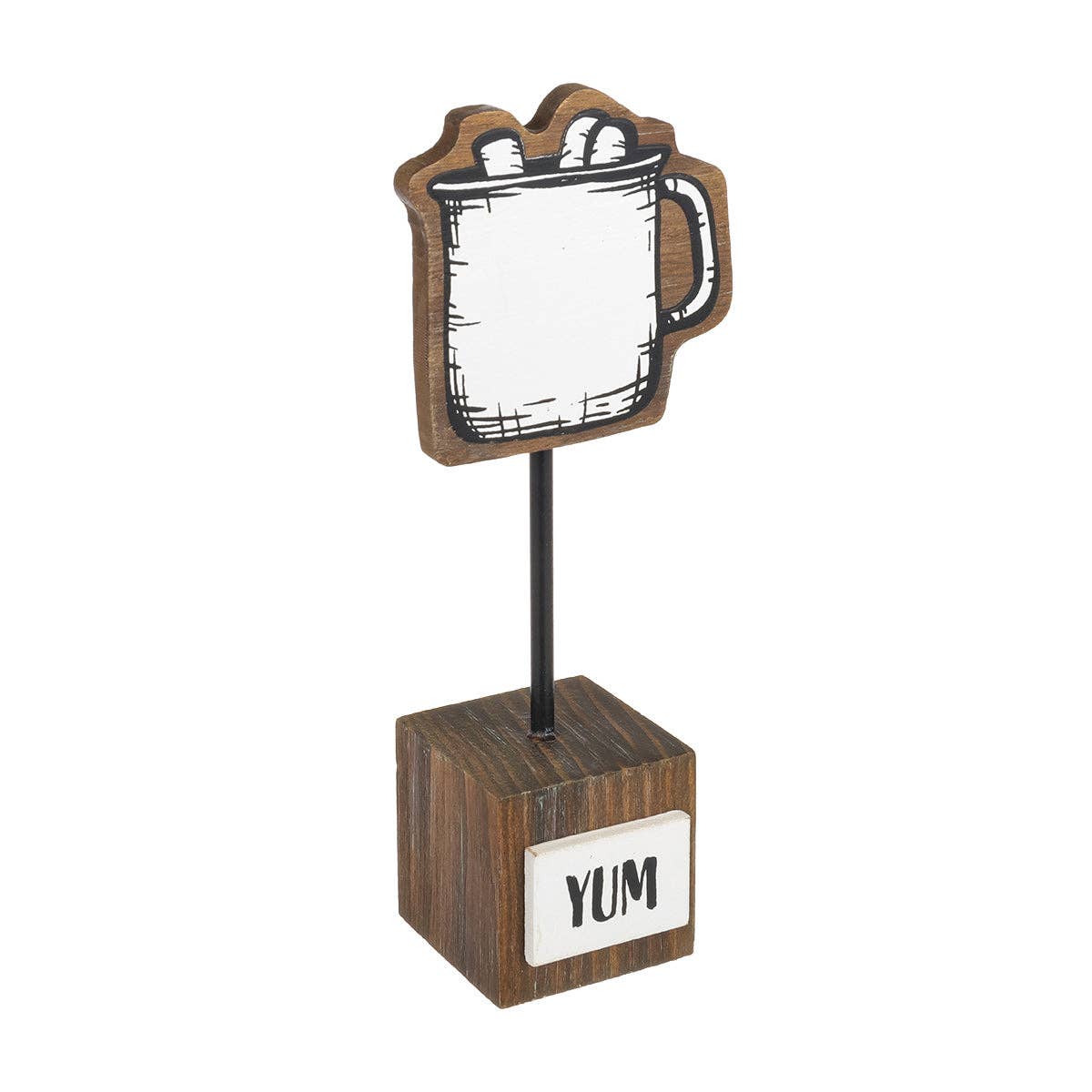 Measuring 2 1/2" wide, 6" tall, and 1 1/2" deep overall, this charming wood doodle mug labeled "yum" is mounted on a black metal rod anchored to a wooden base. It features a white emblem with bold black text, making it a delightful and eye-catching decorative accent for any space.