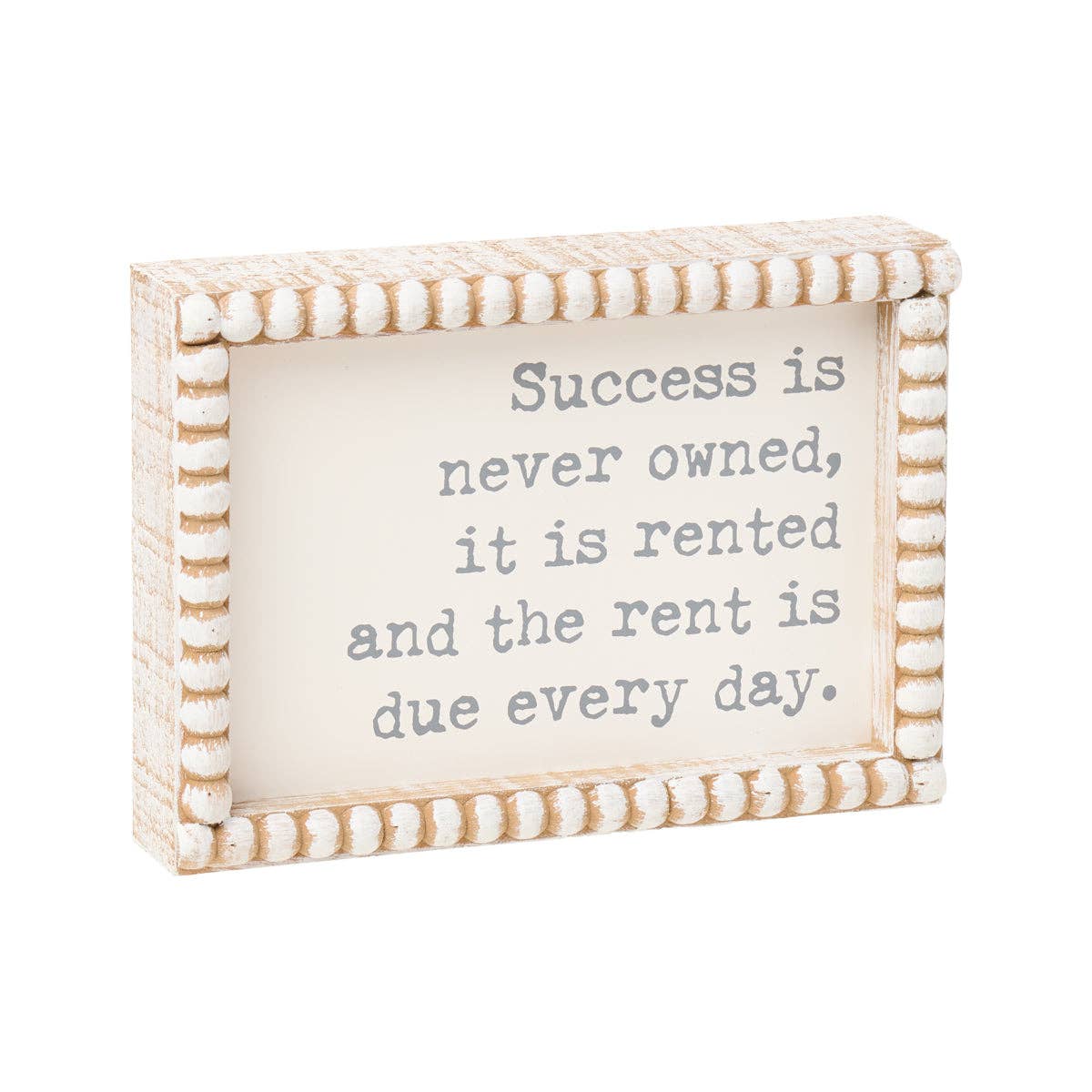 Celebrate daily achievement with this inspiring beaded box sign! Featuring the powerful reminder that "Success is never owned, it is rented and the rent is due every day," this weathered wood piece brings motivation straight to your space. The charming beaded edge frames crisp gray text on a clean white background, creating a timeless look that works anywhere—office, bedroom, or living room. Compact at 7" wide x 5" tall x 1½" deep, it's the perfect size to make a statement without overwhelming your décor. Let this daily dose of inspiration keep you driven!