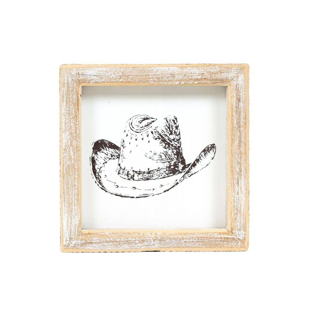 Add a touch of Western charm to your home decor with our 5x5x1.5 Reversible Wood Frame Sign. This versatile sign features two distinct designs in a classic white and black color scheme: one side showcases a stylish cowboy hat, while the reverse side displays a pair of iconic cowboy boots.