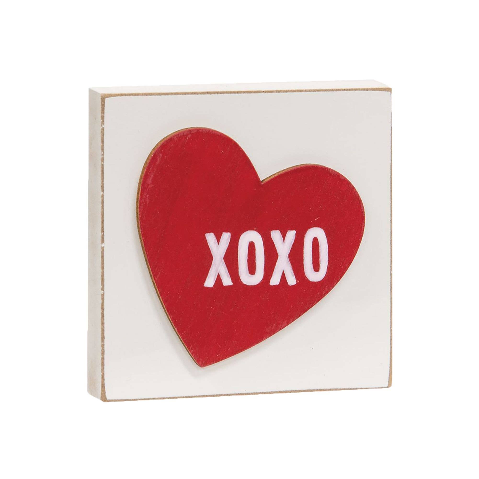 XOXO Heart Square Block is made of wood and features a red heart cut-out in the center. Block reads, "XOXO" in white lettering and it has a distressed white finish for an aged look. Measures 3.5" high by 3.5" wide by .5" deep.