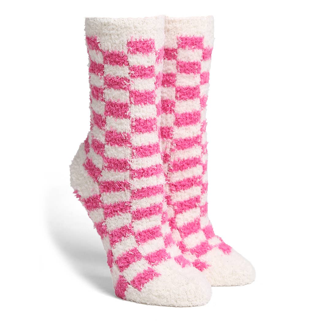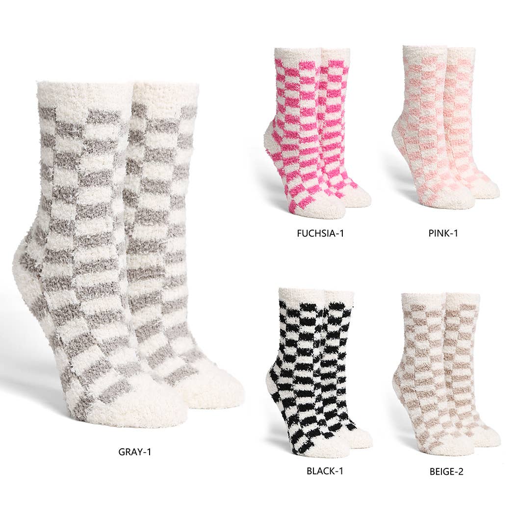 Checkered Crew Fuzzy Winter Socks -100% Polyester Microfiber * Size-One size fits most (socks size 6-11)* Keep your feet cozy and stylish this winter with our Checkered Mini Crew Fuzzy Winter Socks. These ultra-soft socks combine comfort and fashion, making them a must-have for the colder months. Stay warm and stylish all season long with our Checkered Mini Crew Fuzzy Winter Socks—the perfect blend of comfort and fashion.